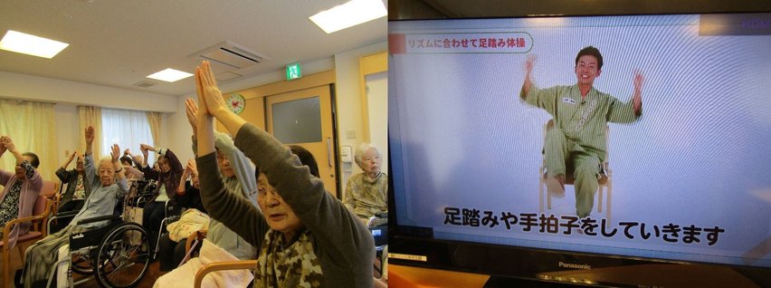 ~なじみある職員:東浦和M職員の先生もあり、ご入居者様の表情も、にこにこで、会話も弾む、とてもいい雰囲気の中の体操でした♪