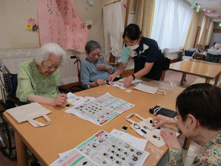 写真はご入居者様のA様、O様、M様。K職員の手解きを受けて。どんなトートバックに仕上がるのでしょうか?