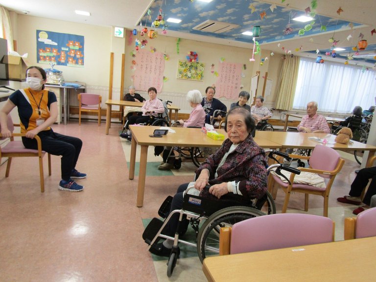 施設では、ティップネスを行いました。ティップネスから先生をお呼びして、ご入居者様に体操や歌をご指導してくださります。
