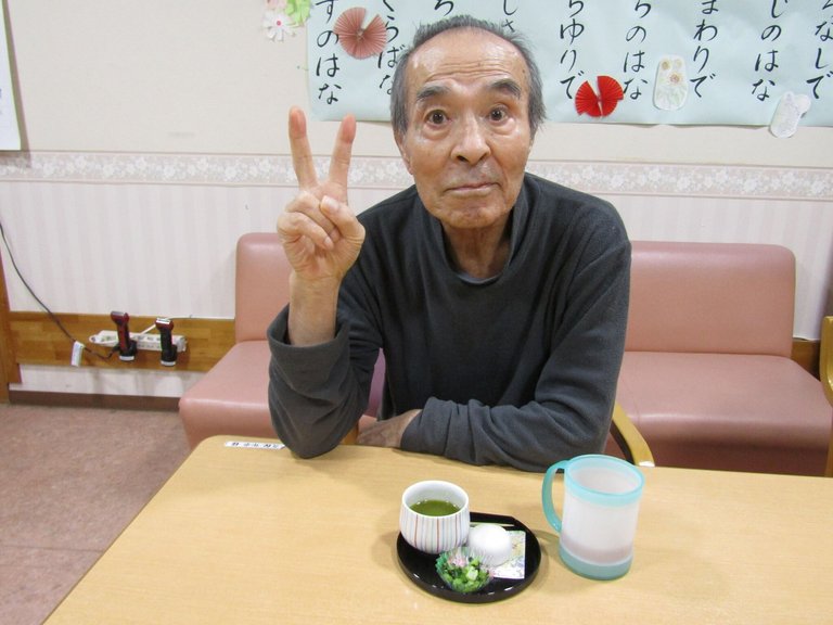 施設では、厨房さんの手作りのおまんじゅうと、抹茶をご提供させて頂きました。