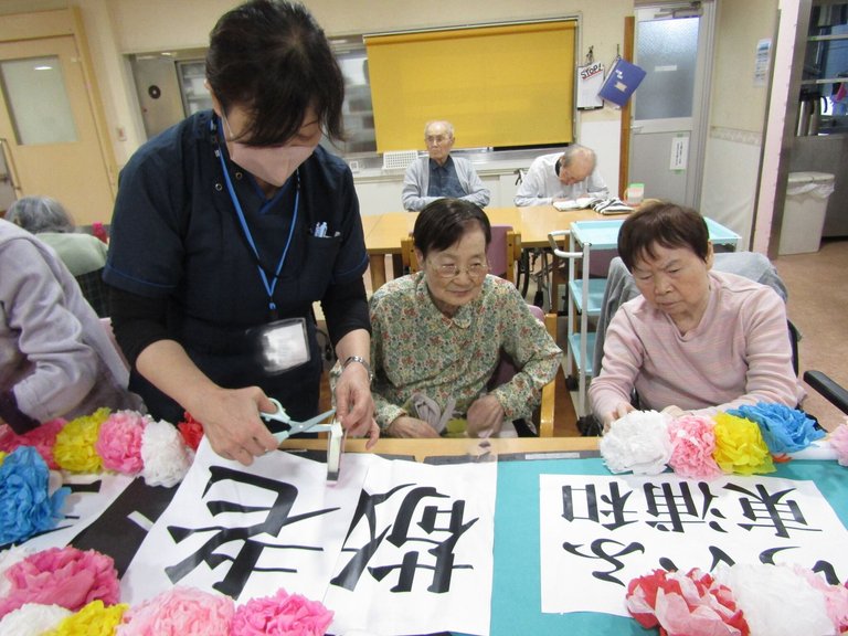 写真は、S職員がご入居者様にお手伝いをお願いして、お花の飾りを付けているところ。ご入居者様も、「ここにこの花がいいね」「ここが空いているね」など、話し合いながら、進めていました。