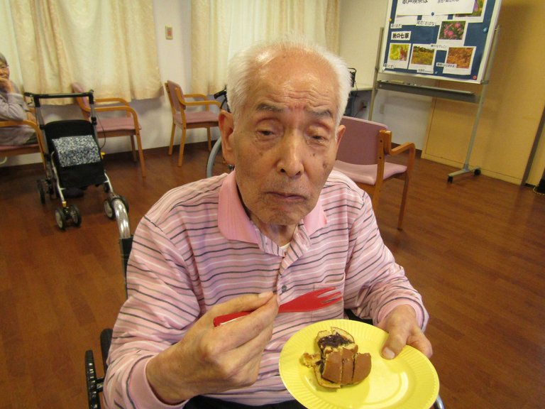 お写真は、T職員がセレクト&用意くださった、大きなどら焼きをほおばる、ご入居者様のS様。