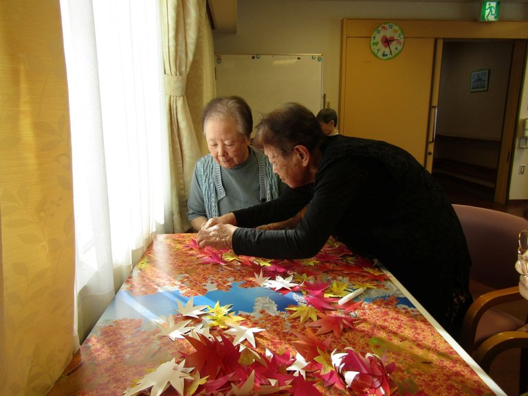 大きな模造紙に、紅葉の風景が描かれており、その上に、もみじにかたどった葉のパーツを貼って頂きます‼色の付いた紙を使ったり、絵の具で独創的なもみじに仕上げたり。ご入居者様の感性で、“錦繍の森”を仕上げましょう☆