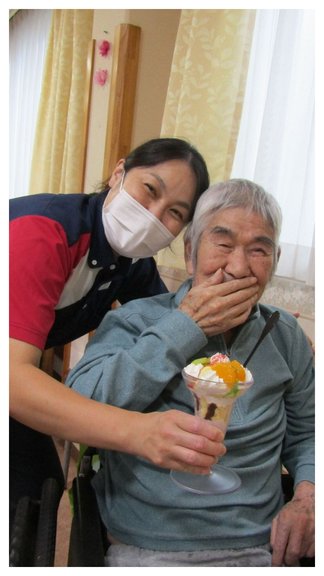 お写真はご入居者様のK様とK職員。パフェを前に、ニッコリ‼