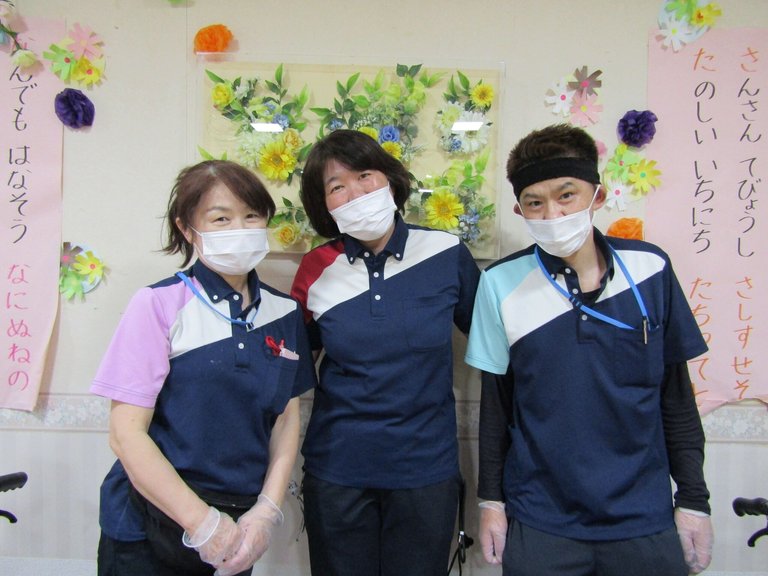 写真は介護職の、Hさん、Aさん、Oさん。協力して、ご入居者様のケアにあたります‼東浦和はチームワークが良い‼(自負⁈)