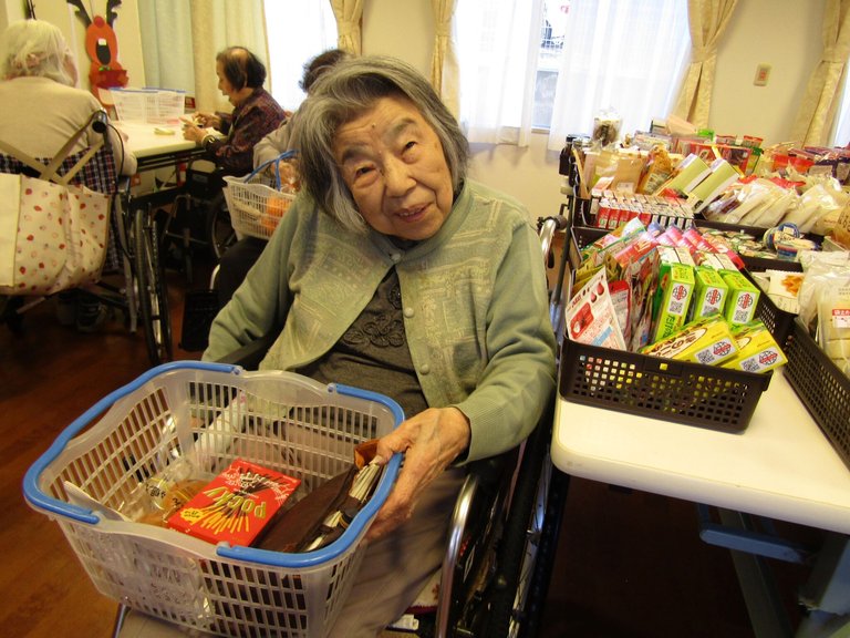 お写真は、買い物を楽しむA様。ご入居期間が長いお一人です。