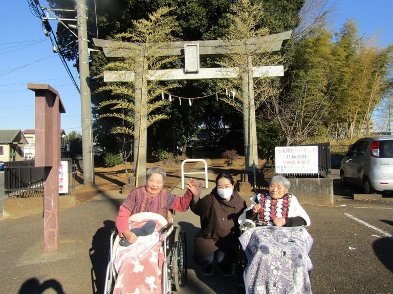 お写真は、鳥居の前で。ご入居者様のO様、Y様とN職員。