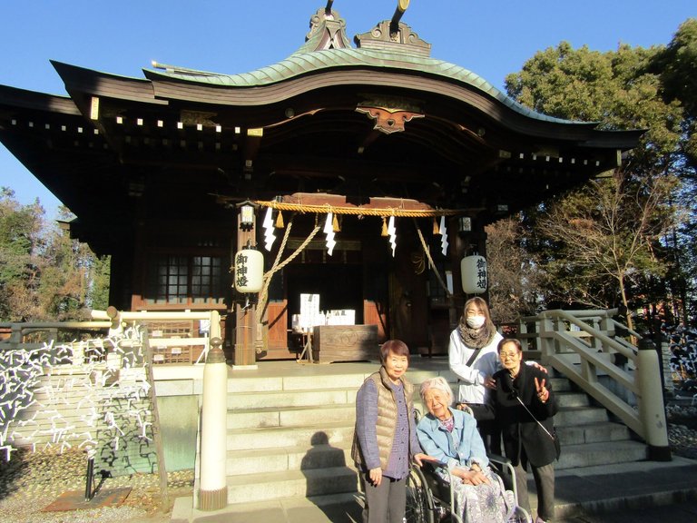 お写真は、本殿の前で。ご入居者様のM様、M様、A様。T職員。