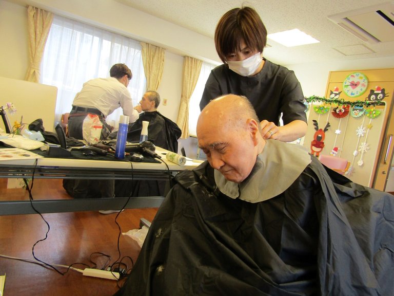 マロンさんがお越しになり、ご入居者様のカットやパーマ、カラー、ひげ剃りなどの身だしなみを整えて下さります。