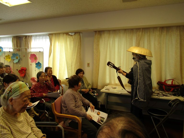 施設では、歌声喫茶の歌声編としてS看護師による回想療法が行われました。