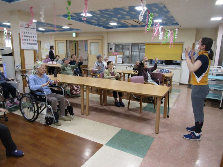 施設では、ティップネスから先生がお越しになり、ストレッチ運動などを行いました。ゆっくりと筋肉を伸ばすことで、痛気持イイ感覚が得られそう。皆様、真剣な面持ちで取り組み中。。