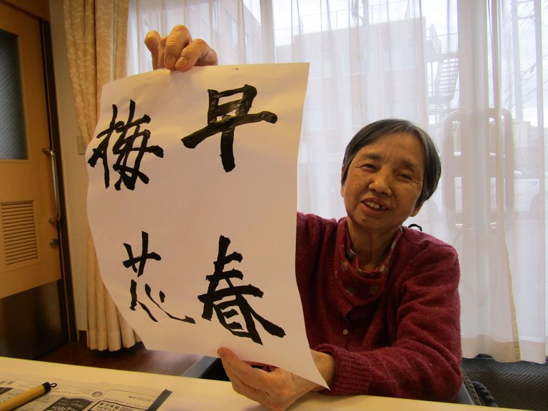 ご入居されていた方のご家族様でいらっしゃるO先生に、お手本を頂きました。今回の課題は、『早春梅花(そうしゅんばいか)』。今の季節にピッタリな言葉です✿