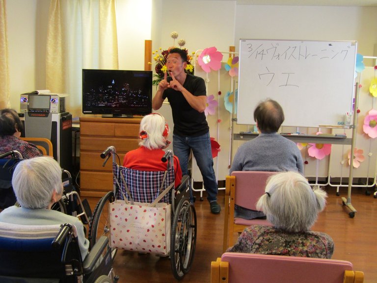今回もパワー溢れるI先生が、皆様に体操でアドバイス。写真は、口角を意識して発声最中。前のめり感からも、アツいオーラが‼