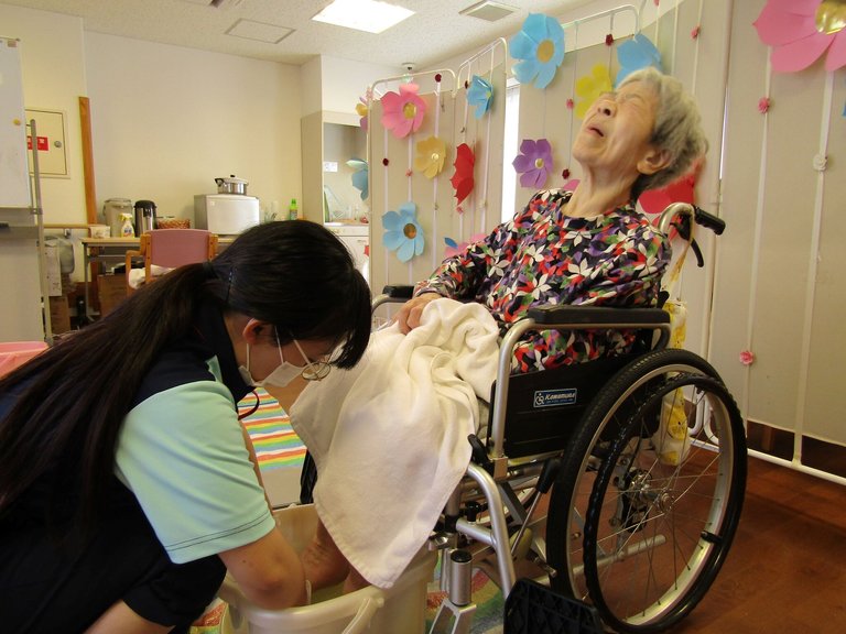お写真は、S職員にマッサージを受けているご入居者様のT様。