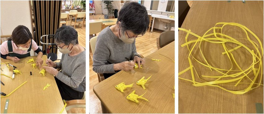 簡単そうにみえてなかなか難しい!ここどうすればいい?もう一回みせてほしい、などご利用者様から積極的に参加して頂きました。完成した金魚をみて、水族館みたいで可愛い、次は色を変えて作ってみたい!とのお声を頂きました♪