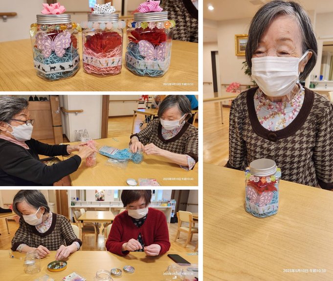 容器にビーズ・マスキングテープなどで飾り付けをし中にカーネーションを入れてみました~