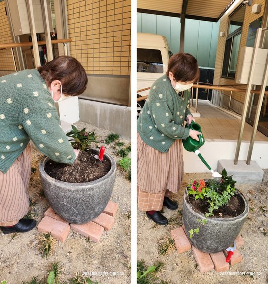 本日は、藤原様と一緒に玄関前の鉢にお花を植えました🎶