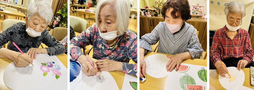 他の曜日の方が作っているのを見られた方やデイサービスで作ったうちわを使用してる方を見られていた今日参加の方々は