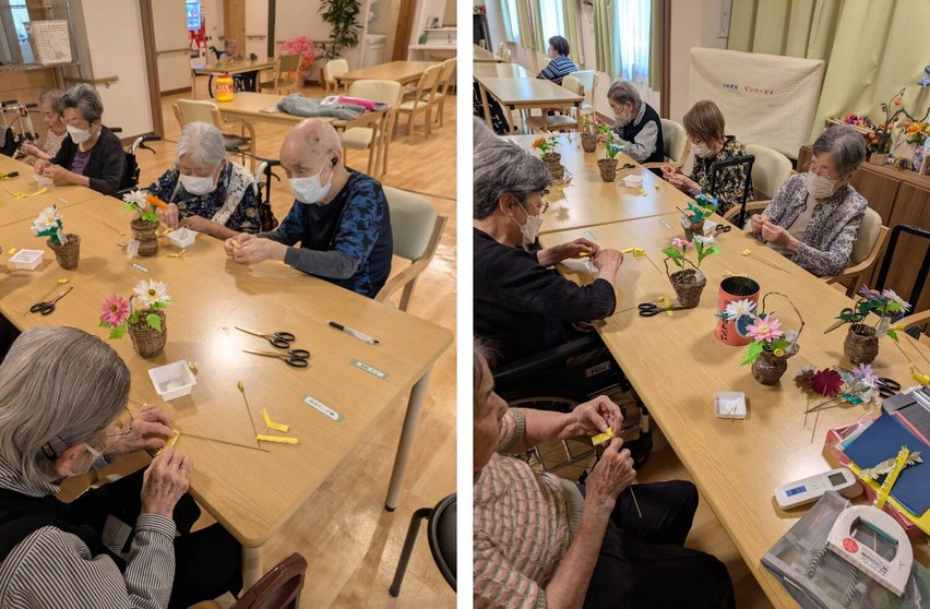 花びらを4重に重ねることでとっても立派なマーガレットが出来上がります。それでも5本分のお花とを作る為に花びらと葉っぱ作るのが中々の作業量です。