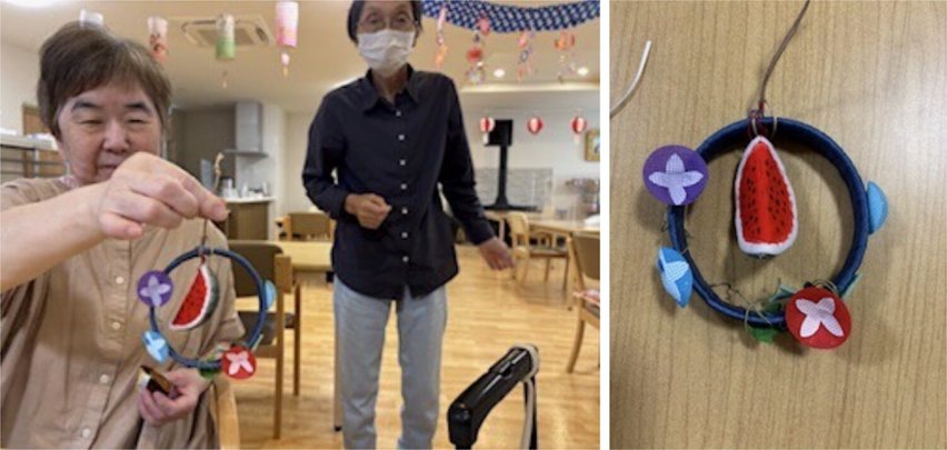 8/13日本日の午前のデイサービスは、スイカのタペストリーを作りました。夏らしいスイカをモチーフに可愛らしいのが出来ました。