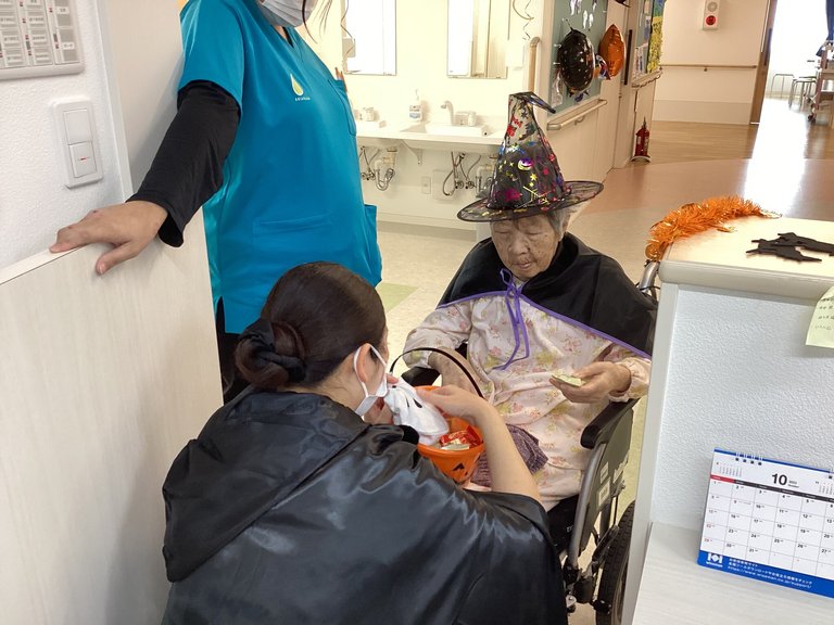 魔女系が多かったですね。皆さんいつもとは違う雰囲気で利用者様からも好評でした。お菓子を貰う合言葉「Trick or Treat!」ちょっと言いづらいですが利用者様も元気よく言って下さりました。お菓子を貰った後は笑顔でした。