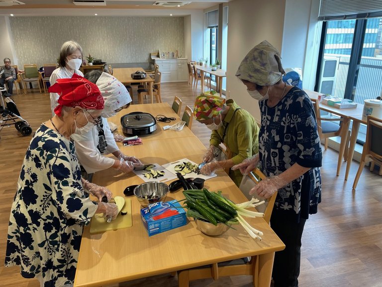 入居者さんには下準備の段階からお手伝いしていただき、野菜の切り方でもそれぞれのご家庭の色があり、なかには「久々に包丁触って懐かしい感じ」と楽しそうに調理されていました。職員だけでなく厨房の調理師も参加してもらい、終始和気あいあいとした雰囲気でした。