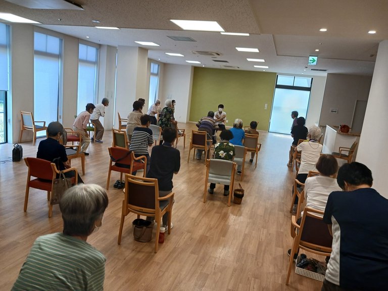 かめじまでは週に1度、系列の病院や老健に勤めているリハビリ専門職の理学療法士・作業療法士を講師に「元気あっぷ体操」を行っています。かめじまの入居者さんや地域にお住いの方々など幅広い年齢の方が参加されています。それぞれの体力や身体状況に合わせ、無理なく体を動かしてもらえるようなプログラムになっています。