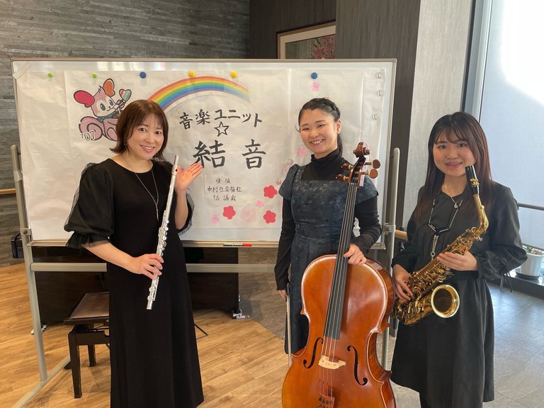 チェロ・サックス・フルートの三重奏で『アヴェマリア』のクラシックから童謡をはじめとする昔懐かしい曲を演奏していただきました。