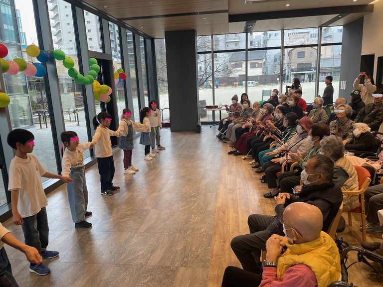 子供たちの笑って踊って跳ねている姿を見て参加された入居者さんもマスク越しでもわかるぐらいの笑みで鑑賞されていました。『365歩のマーチ』や『幸せなら手を叩こう』の踊りでは一緒に身振り手振りなど参加されている方も多く見えました。