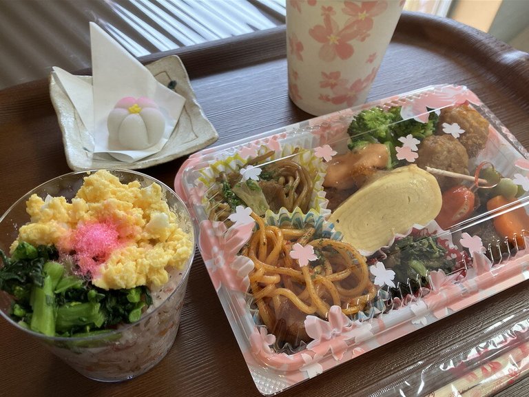 4月2日(水)の昼食に食堂スタッフの思いのこもった「お花見弁当」の提供がありました。掲示板に告知された時から居住者のみなさんは待ち遠しくされていたようです。