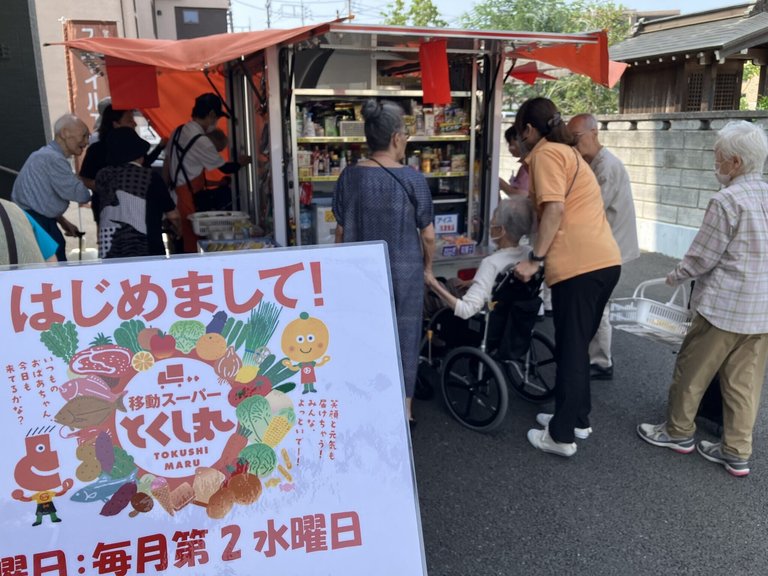 7月9日(水)の午後に、心待ちにしていた移動販売の「とくし丸」さんが初のお目見えとなりました。和気ハウス麻生では近くにコンビニやドラッグストアがあるので、お買い物が出来る方は日頃より自由にお出かけされていますが、一方でお一人での外出がなかなか難しいかたには、ハウスの玄関先まで来ていただける移動販売はありがたい存在です。