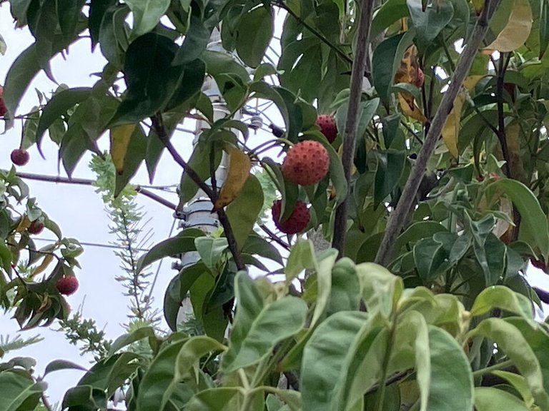 正面玄関の植栽のミモザのお隣の「やまぼうし」に赤い実がなりました。