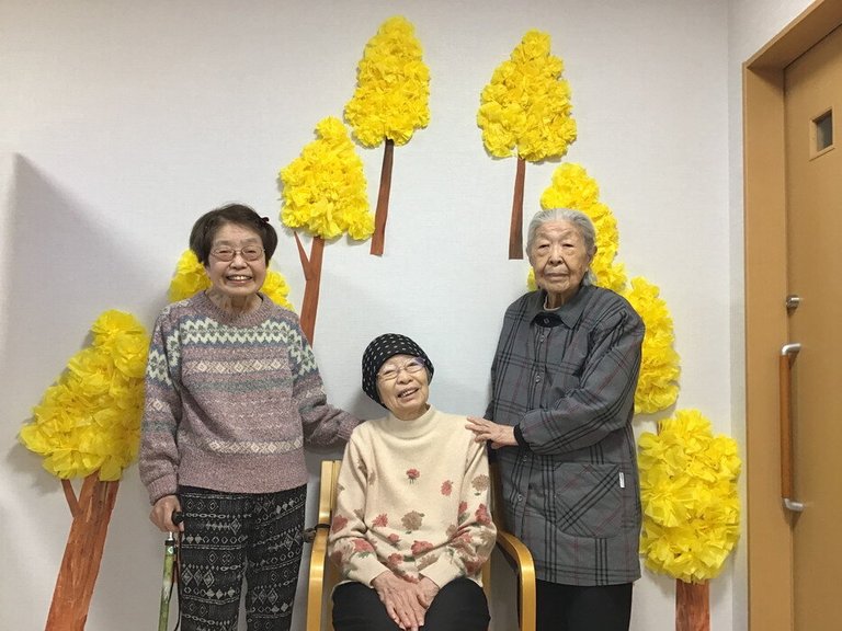 まずは季節の壁紙作成。お花紙でいちょうを作りあげ、まるで並木道を歩いているような写真が撮れるコーナーが出来上がりました。