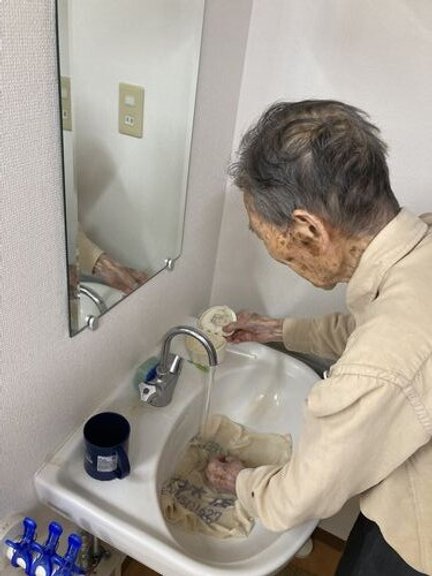 今回は一緒に行う支援の様子ですが、実際に利用者様もご自分の居室内の床や洗面台を掃除してくださっています。
