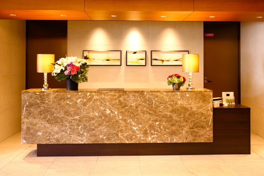 Les芦屋のフロントデスクでは、上質なおもてなしの心で皆さまをお迎えいたします。大理石のカウンターと柔らかな照明が、洗練された空間を演出しています。
