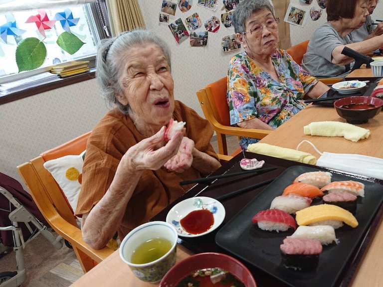 敬老会2日目はお寿司でお祝いです。やはり皆さんお寿司は好きですね! とても喜んでくださいました(写真)。