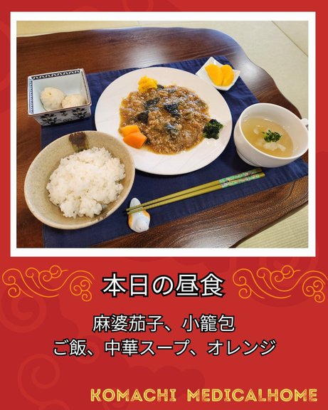 本日の昼食は、麻婆茄子、小籠包、ご飯、中華スープ、オレンジです。