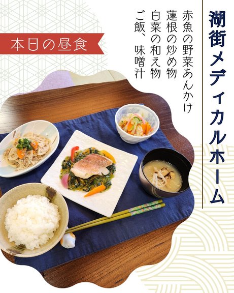 本日の昼食は、赤魚の野菜あんかけ、蓮根の炒め物、白菜の和え物、ご飯、味噌汁です。