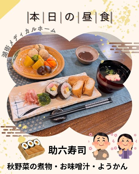 本日のメニューは、助六寿司・秋野菜の煮物・お味噌汁・ようかんです。