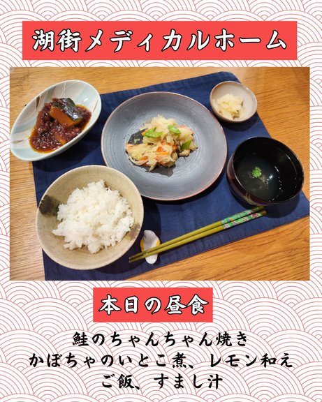 本日の昼食は、鮭のちゃんちゃん焼き、かぼちゃのいとこ煮、レモン和え、ご飯、すまし汁です。