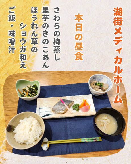 本日の昼食は、さわらの梅蒸し、里芋のきのこあん、ほうれん草のショウガ和え、ご飯、味噌汁です。
