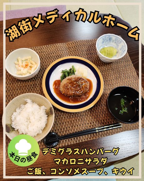 本日の昼食は、デミグラスハンバーグ、マカロニサラダ、ご飯、コンソメスープ、キウイです。