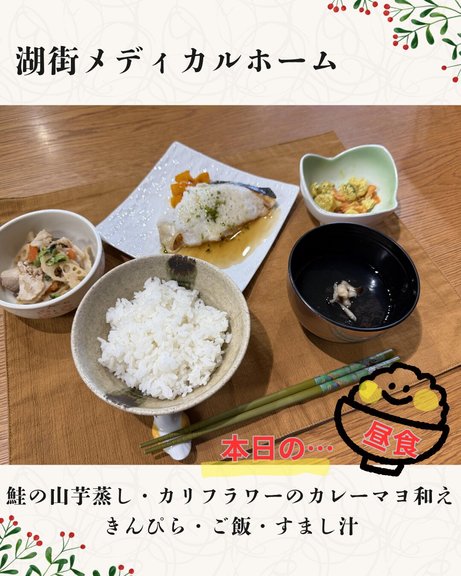 湖街メディカルホームでは、自営の厨房で調理し、管理栄養士のもと栄養バランスと旬の食材、出来立てにこだわって多彩な食事メニューをご提供しております。