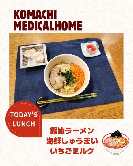 本日の昼食は、醤油ラーメン、海鮮しゅうまい、いちごミルクです。