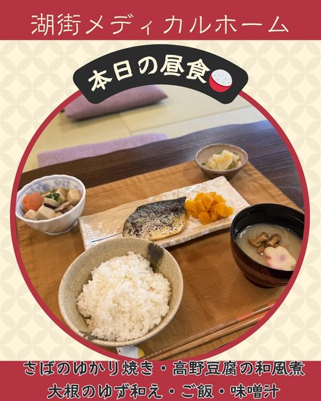 本日の昼食は、さばのゆかり焼き、高野豆腐の和風煮、大根のゆず和え、ご飯、味噌汁です。