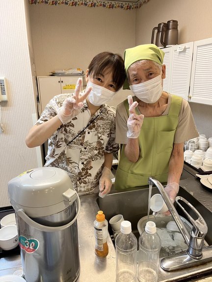 生活リハビリで洗い物しました。リハビリ職員とピースサイン