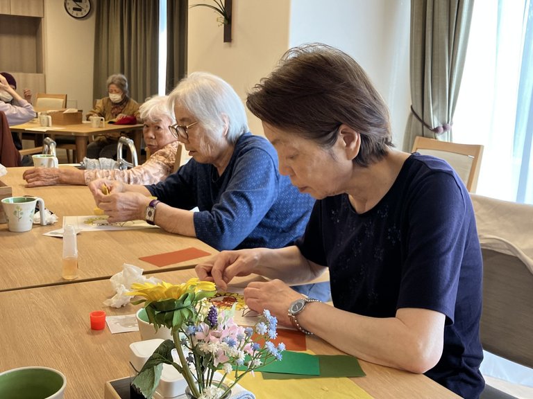 手先を使って紙をちぎる作業は、指先の運動にもなり、脳の活性化にも効果的です。皆さん「この花びらはここに貼ろうかしら」「もっと明るい黄色がいいね」などとお話しながら、和やかな雰囲気の中で集中して取り組んでいらっしゃいました。