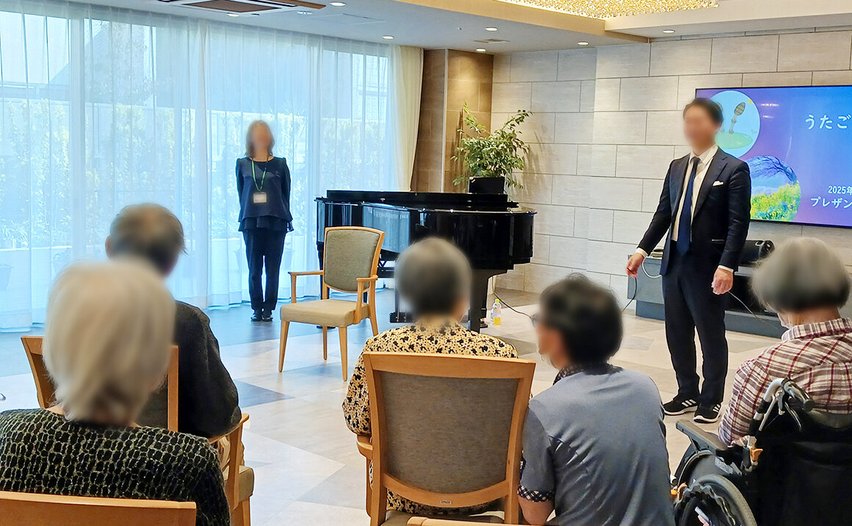初日の開催ではご入居者様と他施設のご利用者様がご参加され音楽療法士のピアノの演奏に合わせて季節の曲やお客様からの