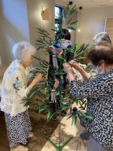 願いを込めて書いた短冊を笹の葉に吊るして、