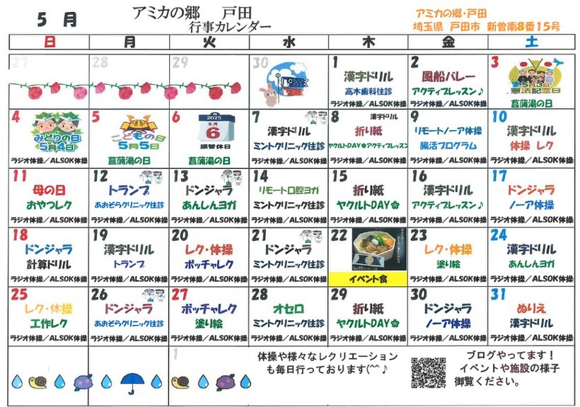 5月のレクリエーションカレンダーと今月のイベント食の予定となります。